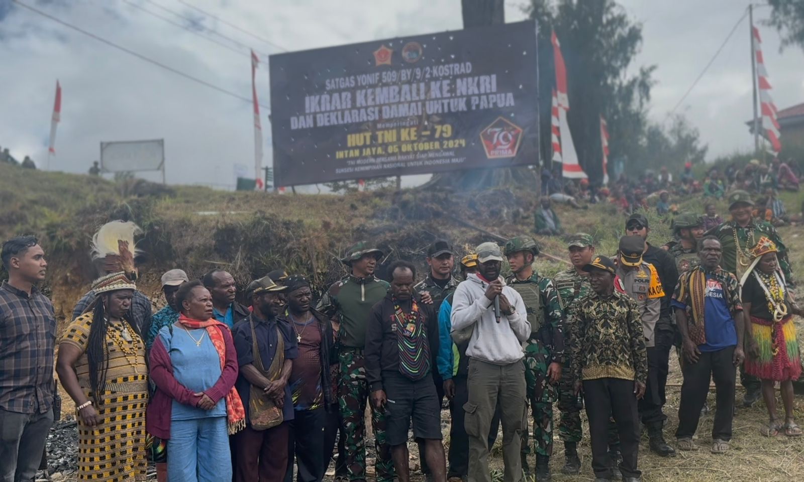 Kegiatan perayaan HUT TNI ke-79 2024 di Sugapa Kabupaten. Intan Jaya dilaksanakan dengan upacara adat bakar batu yang merupakan simbol kedamaian dan kebersamaan. Kegiatan diawali dengan pembagian buku gratis, pengobatan massal, pembagian alat musik untuk gereja, alat olah raga, bantuan sosial, makan bersama, tari-tarian/joget, hingga pengucapan ikrar eks TPN OPM kembali ke NKRI.