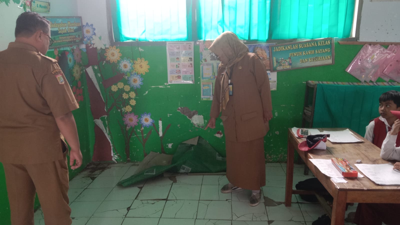“Dan mirisnya, kata Liswati, bagian tembok utara ruang kelas 3 kayaknya sudah terpisah dengan pondasi. “Tembok itu sepertinya mau copot. Kami khawatir jika terjadi gempa”, ucap Liswati dengan suara galau.